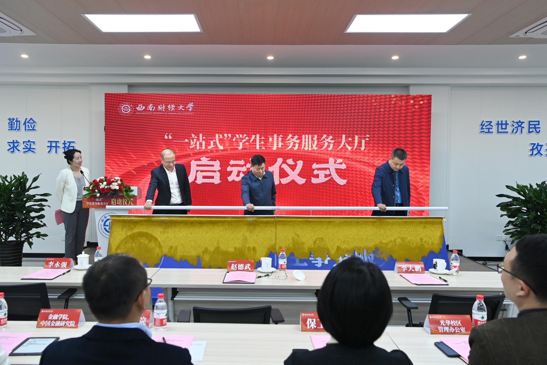 10月31日下午,西南財經大學光華校區“一站式”學生事務服務大廳正式啟動。黨委書記趙德武,黨委副書記、校長李永強,四川省教育廳宣傳思想與統戰工作處處長李大鵬出席,共同為服務大廳揭牌。相關職能部門負責人、學院(研究院)學生工作負責人,學生黨建指導中心學生黨員、第九期學生骨干培訓班學員參加啟動儀式。與會嘉賓參觀了“一站式”學生社區服務大廳各項分場活動開展情況。