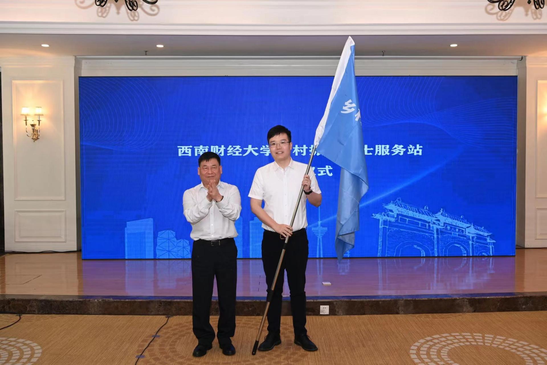 趙德武為鄉(xiāng)村振興博士服務(wù)團授旗,服務(wù)團成員代表中國西部經(jīng)濟研究院教工第一支部書記李雪峰接旗。