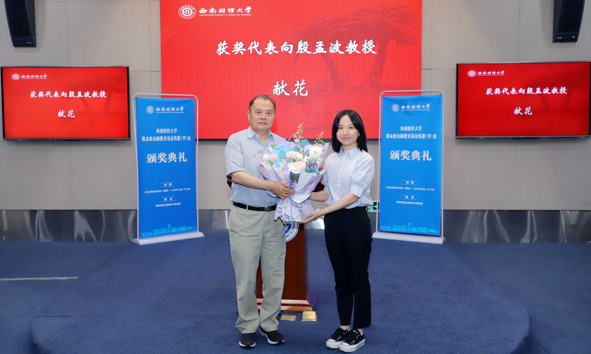 典禮上,獲獎教師代表陳苡文對學校、學院的栽培、殷教授的鼓勵以及學生、家人的支持表達誠摯感謝;獲獎學生代表陳俊橋回顧了在西財三年的成長經歷,對培養自己的恩師和陪伴自己的家人、朋友表示感謝。
