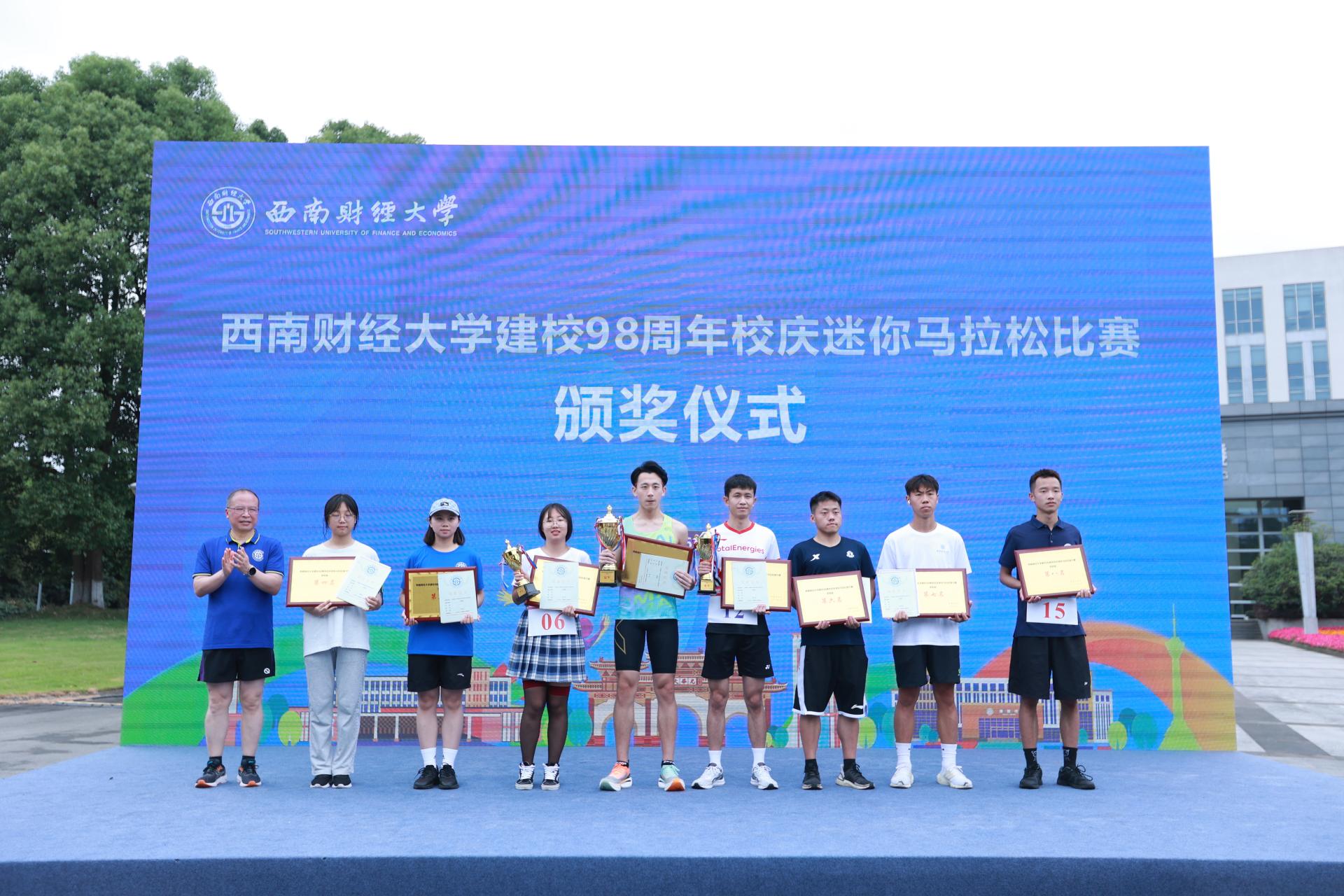 健康跑結束后舉行了迷你馬拉松混和接力賽和個人賽,300余名師生及校友參加角逐。體育學院院長楊遠波為比賽鳴槍發令。李永強為獲獎運動員和團隊頒獎。