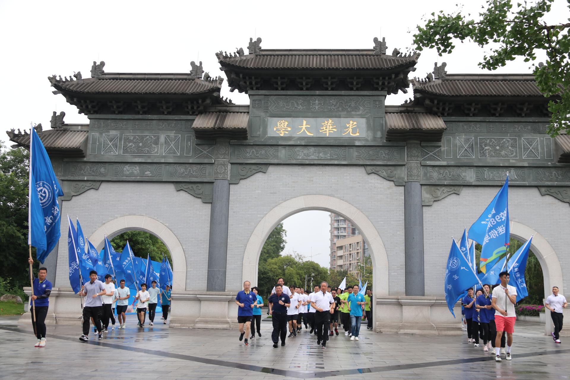 上午9時,“健康跑”首先在光華校區拉開帷幕,黨委副書記、副校長李永強,黨委常委、副校長張邦富帶領相關中層干部及師生穿過芳草綠樹,感受學校的深厚底蘊和“大運會”帶來的蓬勃朝氣。10時30分,在大屏幕上校友們聲聲祝福、校舞蹈隊激情獻舞的烘托下,黨委書記趙德武發令槍聲響起,柳林校區校慶“健康跑”活動正式開始。師生們身著印有校徽的五彩運動服從騰驤樓前啟程,途徑梅園、創業大道沿線,穿過光華大學校門來到濟民廣場,最后行經經世樓到達終點北大門。伴隨“發展體育運動、增強人民體質”“經世濟民,孜孜以求”“我運動、我健康,我運動、我快樂”的響亮口號,師生們、校友們用矯健的步伐表達對學校的祝福、對健康的守護、對生命的熱愛。