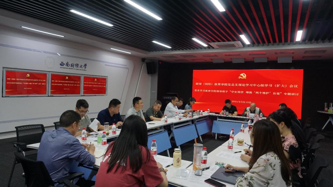 根據學校黨史學習教育工作安排,5月10日上午,繼續(網絡)教育學院黨總支在光華校區計算機樓未來教室召開2021年第2次理論學習中心組學習(擴大)會議,開展“學史增信 增強‘兩個維護’自覺”專題研討。學校黨委常委、副校長歐兵到會開展導學并作點評講話,學校黨史學習教育第10指導組組長黃海波到會指導。學院黨總支書記殷曉明主持會議。